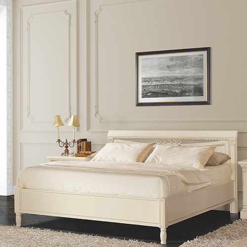 Кровать с низким изножьем Florence Bianco Флоренция является воплощением комфорта и уюта. Лаконичный дизайн идеально сочетается с интерьером в классическом итальянском стиле. Изголовье кровати выполнено массива и шпона ясеня и украшено резным узором и декоративной вставкой с кольцами, которая придает кровати неповторимую изюминку. Корпус произведен из шпона ясеня, покрытого матовой эмалью, что добавляет свежести и непринужденности всей конструкции. Все декоративные элементы патинированы золотом. В комплектацию кровати включено металлическое ортопедическое основание с латами из березы.